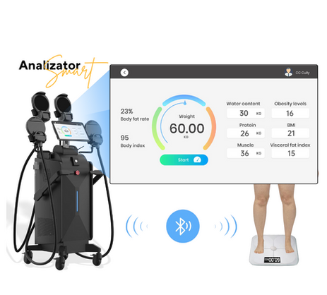 Analizorul de compozitie corporala conectat la aparat prin Bluetooth poate inregistra si analiza date variabile inainte si dupa tratament, cum ar fi greutatea, masa musculara, indicele IMC, nivelul de obezitate etc.